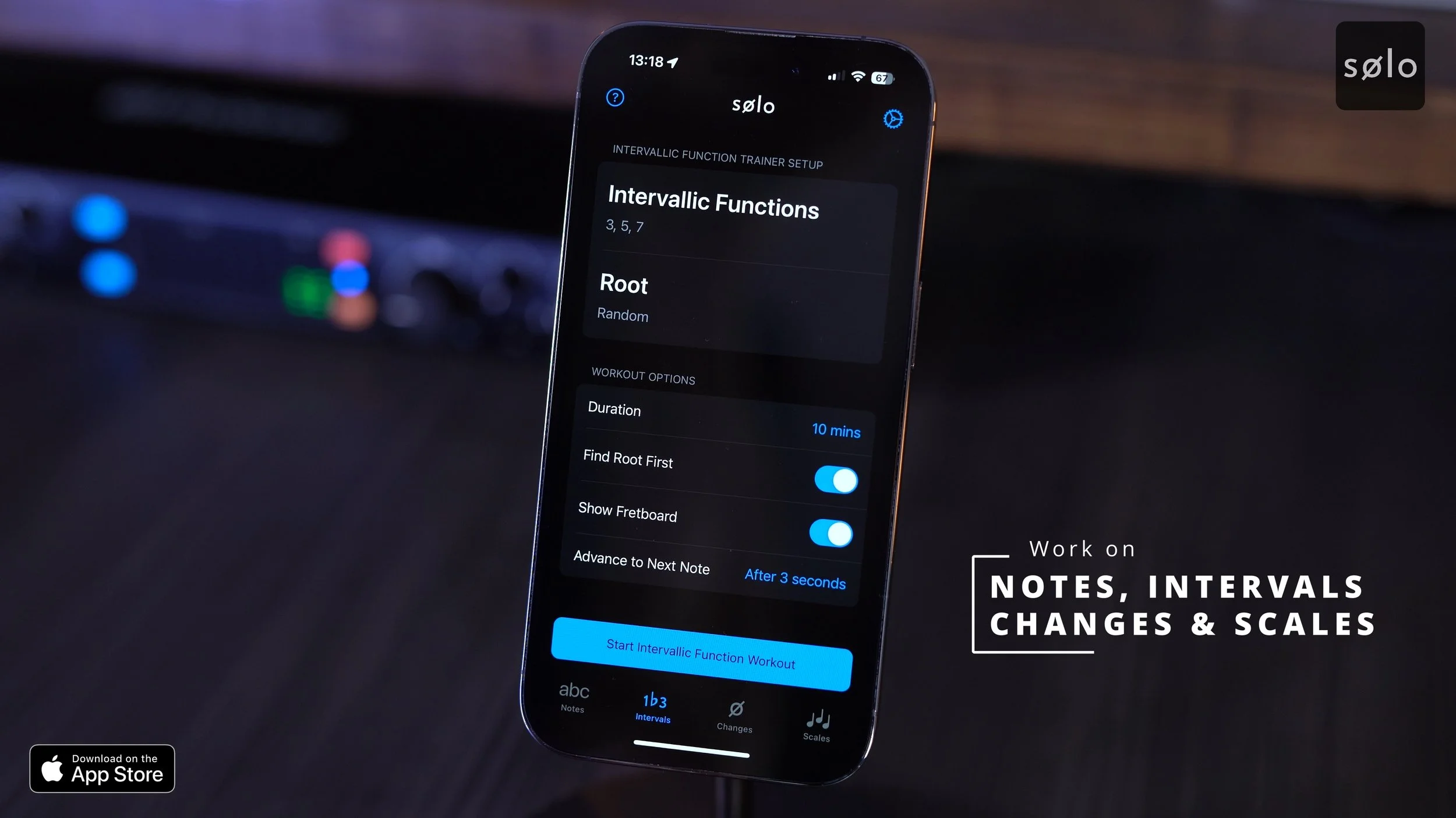 • Solo intelligently maps out the correct intervals over each chord and listens for you to play each intervallic function in the specified order.